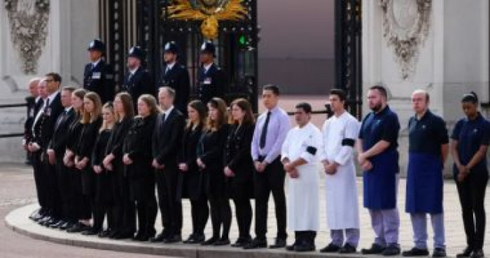 واصطف أعضاء طاقم العمل في قصر باكنجهام أمام المبنى لتقديم احترامهم للملكة، فيما كان الطهاة والخدم وضباط الشرطة من بين الموظفين الذين يقفون أمام مقر الملكة الرئيسي.