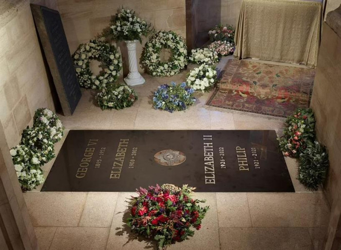 ودُفنت الملكة إليزابيث يوم الإثنين الماضي بعد جنازة رسمية في كنيسة وستمنستر آبي، وكُتب على الحجر بحروف نحاسية "جورج السادس 1895-1952 / إليزابيث 1900-2002" في السطرين العلويين، متبوعًا بنجمة تخص وسامًا رفيعًا ثم "إليزابيث الثانية 1926-2022 / فيليب 1921-2021" في السطرين السفليين.