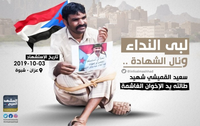 استشهد صباح الخميس 3 اكتوبر 2019، المواطن سعيد تاجره القميشي، خلال توجهه إلى مدينة عزان بشبوة للمشاركة في التظاهرات السلمية التي تطالب بعودة النخبة الشبوانية.