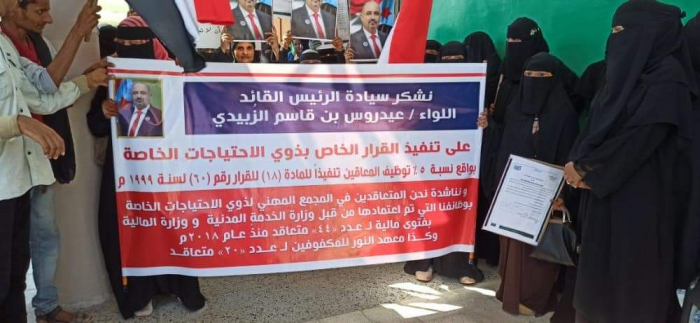 ودعوا الرئيس الزُبيدي إلى تمكينهم من الوظائف المعتمدة من وزارتي الخدمة المدنية والمالية في العام 2018م، بعدد 44 وظيفة للمتعاقدين في المجمع المهني لذوي الاحتياجات الخاصة، و20 وظيفة لمتعاقدين في مركز النور للمكفوفين.
