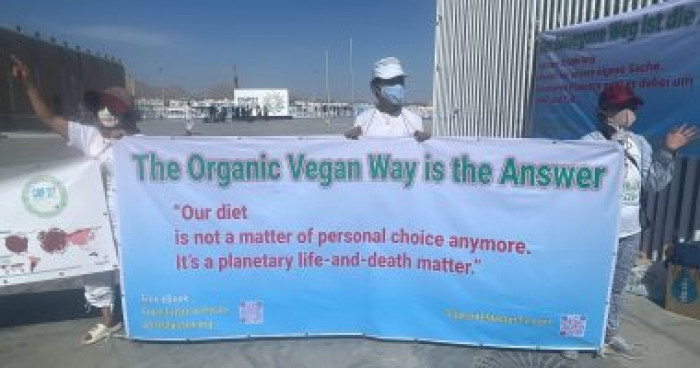 أقام مجموعة من نشطاء البيئة فى العالم، تظاهرة سلمية لمنع ذبح الحيوانات، وذلك أمام المدخل الرئيسي للمنطقة الزرقاء بمقر انعقاد مؤتمر المناخ بمدينة شرم الشيخ.