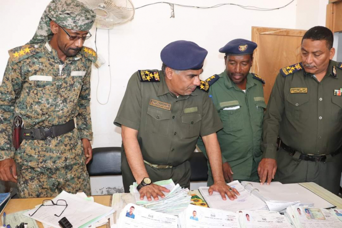 كما استمع من مدير فرع إدارة الأحوال المدنية والسجل المدني بالمديرية، الملازم ثاني صالح باحميل، إلى إجراءات استخراج البطاقات الشخصية، موجهًا بتسهيل معاملات المواطنين حسب اللوائح القانونية.