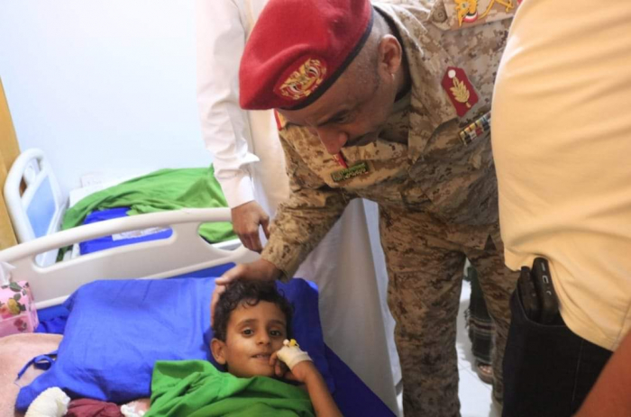 تفقد اللواء ركن طيار فائز منصور التميمي، قائد المنطقة العسكرية الثانية، جرحى التفجير الإرهابي بمسجد الزيار في منطقة حول التابعة لمديرية يبعث، بمستشفى حضرموت في مدينة المكلا.