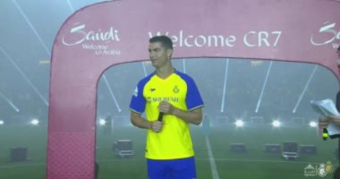 وجه النجم البرتغالي كريستيانو رونالدو لاعب النصر السعودي الجديد، التحية لجماهير فريقه باللغة العربية خلال تقديمه بملعب "مرسول بارك".