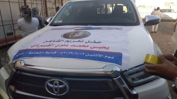 قدموا إليه سيارة طراز تويوتا هايلوكس ومبلغا ماليا وعشرات الدروع والشهادات التقديرية، مثمنين أشعاره للجنوب وسجاله الشعري دفاعا عن القضية الوطنية الجنوبية.