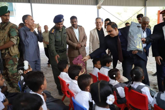 وشهد الطابور الصباحي لروضتي 14 أكتوبر و26 سبتمبر، وجانبًا من إبداعات ورقصات البراعم والزهرات، وأهداهم الهدايا والحقائب المدرسية ابتهاجًا بذكرى المقاومة الشعبية.