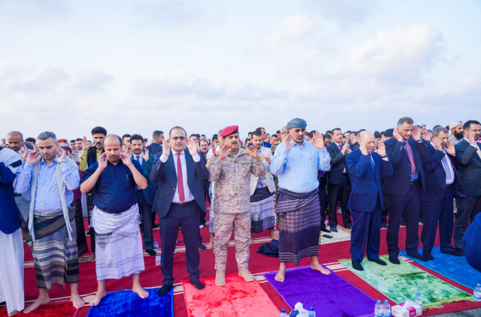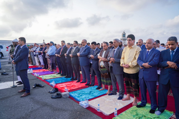 الرئيس الزُبيدي ولملس والعليمي يؤدون صلاة عيد الفطر بعدن