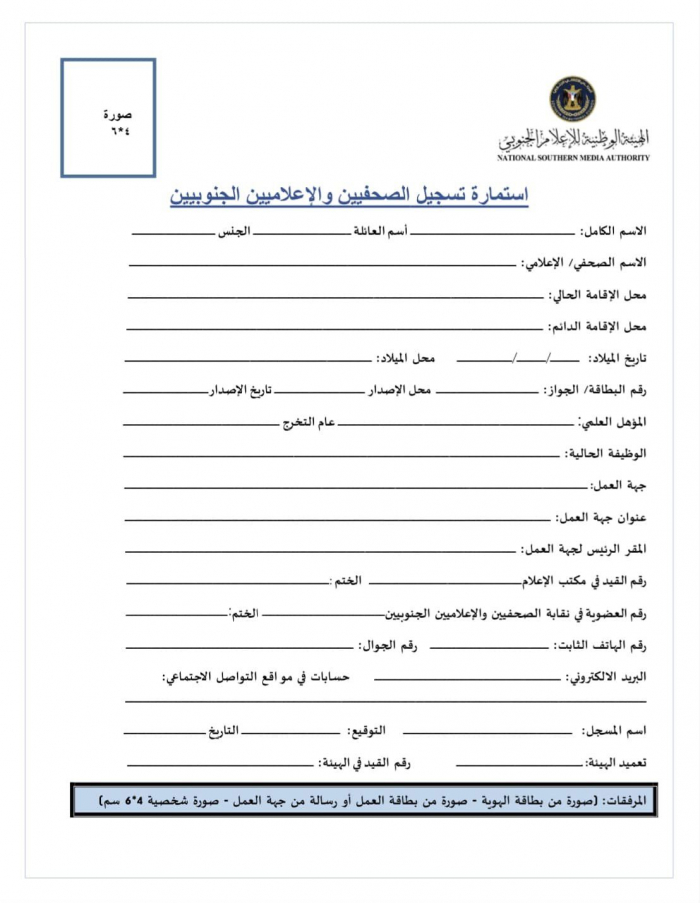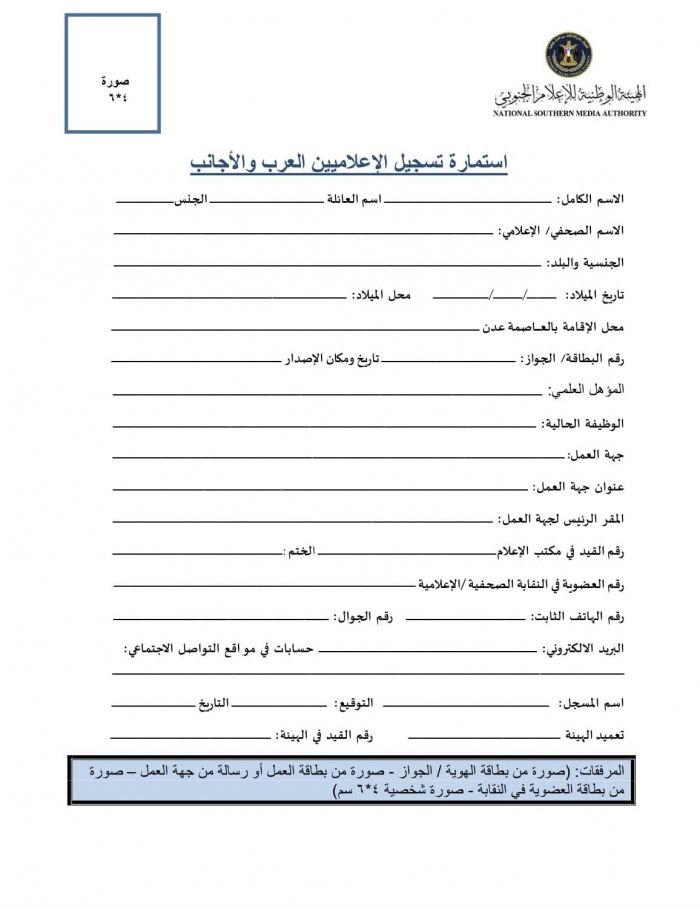 استمارة تسجيل الصحفيين المحليين والعرب والأجانب بالجنوب