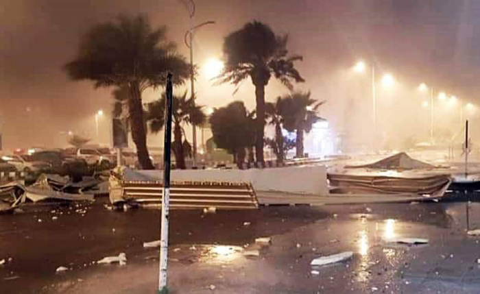 وشهد المطار إصابات جراء سقوط أجزاء من واجهات زجاج صالة المطار خلال إنهاء معاملتهم للسفر نتيجة العاصفة الرعدية والرياح الشديدة والأمطار فجر اليوم الاثنين، وتضرر منها بعض أجزاء المطار.