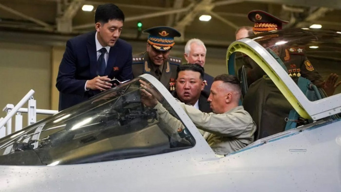 وذلك خلال زيارته لمصنع طائرات مقاتلة روسي، التقى كيم بطياري الاختبار في ورشة تجميع جسم الطائرة المقاتلة واستقل طائرة من طراز سو-57 للاستماع إلى شرح مفصل للمواصفات الفنية وأداء الطيران للطائرة المقاتلة من الجيل الخامس.