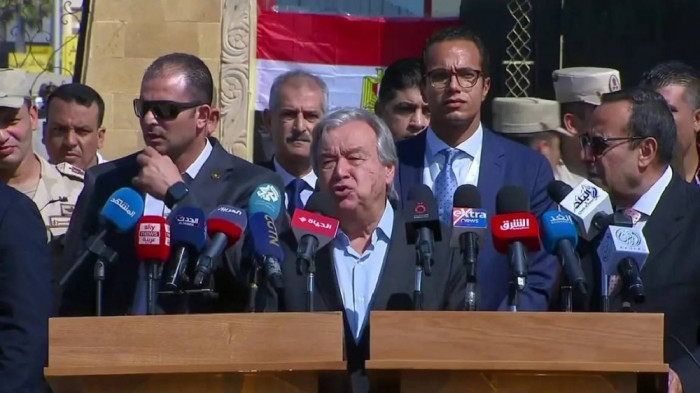 وقال غوتيريش في كلمة أمام معبر رفح، اليوم الجمعة، إن أكثر من مليوني شخص دون ماء أو طعام أو وقود، مشدداً على أن إدخال المساعدات هو الفارق بين الحياة والموت للكثيرين في القطاع.