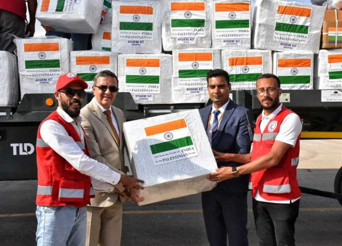 وسلم سفير الهند بالقاهرة أجيت جوبتيه، مواد الإغاثة إلى «الهلال الأحمر المصري» لنقلها إلى غزة، حيث تشمل مواد الإغاثة إمدادات طبية (حوالي 6.5 طن) ومواد الإغاثة (حوالي 30 طنًا)، والتي تضم خيام ومواد صحية أساسية وأقراص تنقية المياه، وما إلى ذلك.