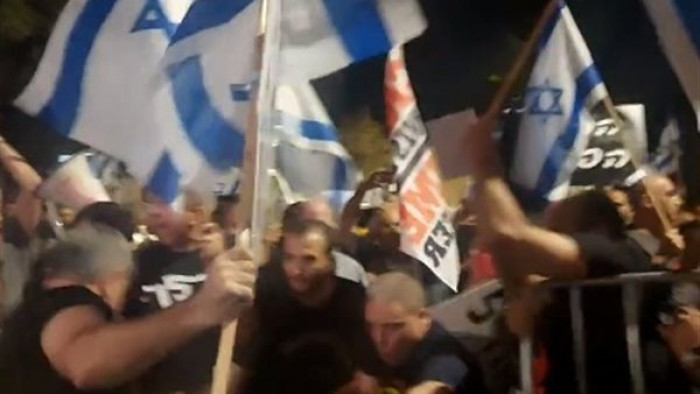 ولوح المئات بالعلم الإسرائيلي مرددين هتافات "السجن الآن"، قبل أن يقتحموا حواجز الشرطة حول مقر إقامة نتنياهو في القدس.