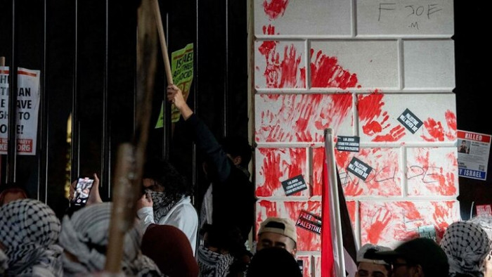 لطخ متظاهرون سور وأبواب البيت الأبيض بالطلاء الأحمر، تعبيرا عن مناهضتهم للحملة العسكرية العنيفة، التي تشنها إسرائيل على قطاع غزة.