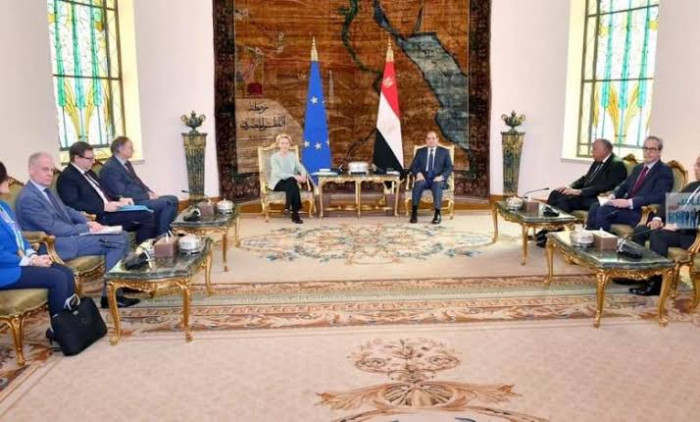 كما شدد السيسي خلال اللقاء على رفض مصر القاطع لتهجير الفلسطينيين، سواء بالنزوح داخليا أو بالتهجير خارج أراضيهم لاسيما إلى الأراضي المصرية في سيناء، وهو ما اتفقت معه رئيسة المفوضية الأوروبية، مؤكدة الموقف الأوروبي برفض التهجير.