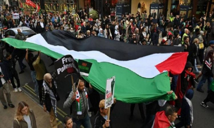 ولوح نحو 200 شخص خلال تجمعهم بطريق الرينج الرئيسي أمام البرلمان، بعشرات الأعلام الفلسطينية ورفعوا لافتات مكتوبًا عليها "الإبادة الجماعية ليست دفاعًا عن النفس" و"الصهيونية هي الفاشية".