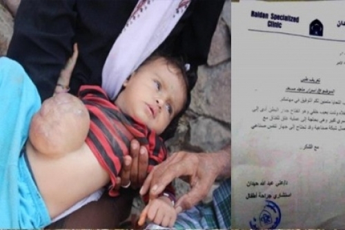 وتعاني الطفلة اليمنية، أسرار من ورم كبير في الجزء الأمامي من البطن.