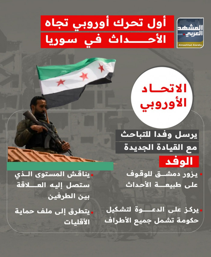 قرر الاتحاد الأوروبي إرسال وفد إلى سوريا، لبحث مستجدات الأوضاع مع القيادة الجديدة، ومناقشة المستوى الذي ستصل إليه العلاقة بين الطرفين.