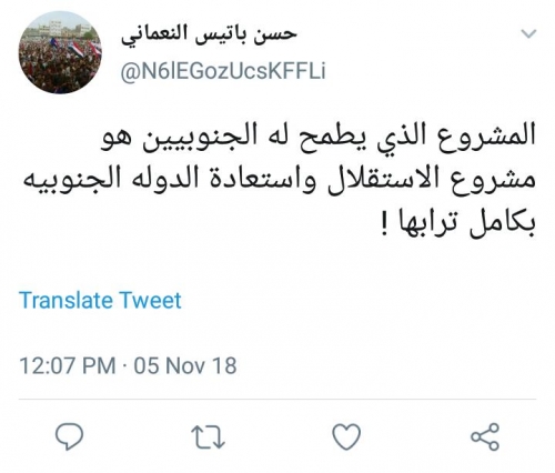 أكد الناشط السياسي الجنوبي "حسين باتيس النعماني"، فى تغريدة له على موقع التغريدات القصيرة "تويتر"، رصدها المشهد العربي، ان الجنوب يسعي لتحقيق أهدافه المتمثلة فى استقلال واستعادة كل شبر من تراب الدولة الجنوبية، قائلا: "المشروع الذي يطمح له الجنوبيين هو مشروع الاستقلال واستعادة الدوله الجنوبيه بكامل ترابها" .