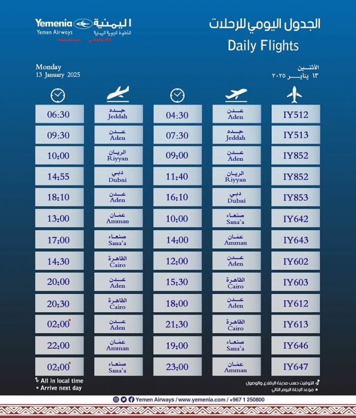 تنطلق 13 رحلة طيران غدا الاثنين، للخطوط الجوية اليمنية، إلى وجهات متفرقة، على النحو التالي: