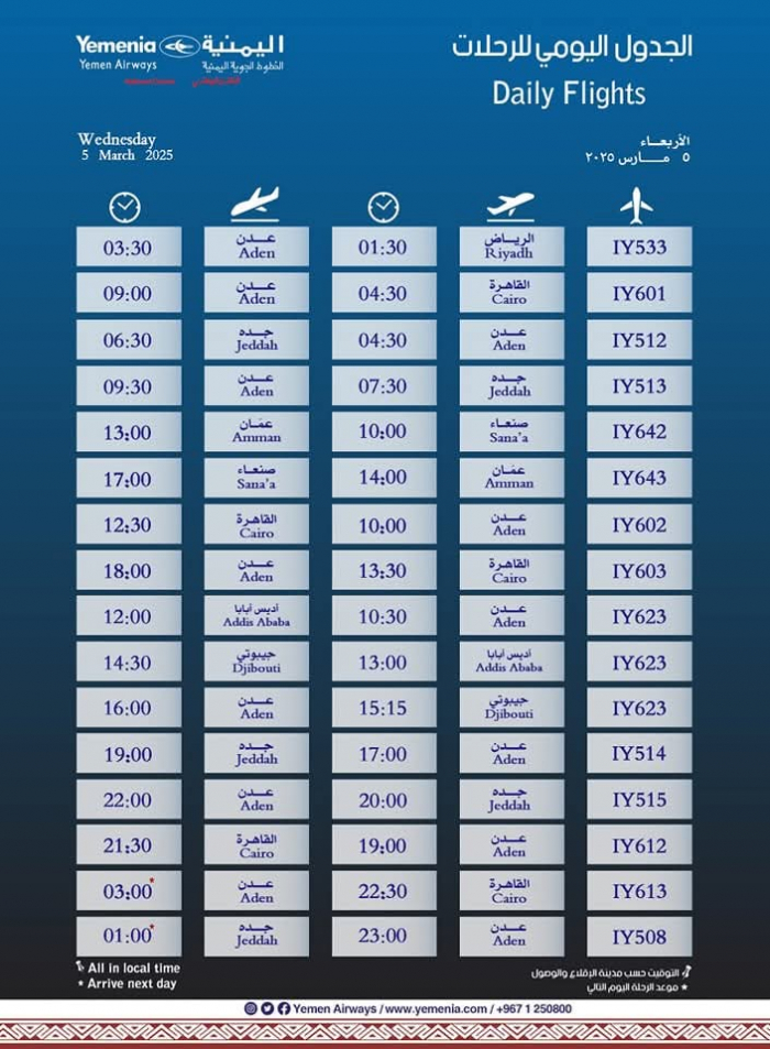 تنطلق عدة رحلات طيران للخطوط الجوية اليمنية غدا الأربعاء، إلى وجهات متفرقة كالتالي: