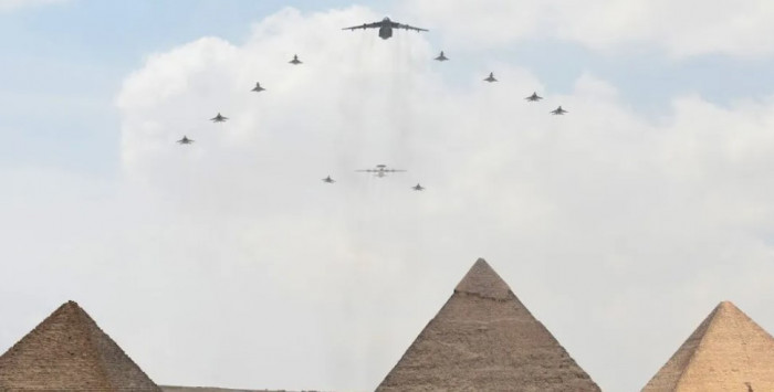 كما نفذت مجموعة من المقاتلات المشاركة بالتدريب، وفق البيان، تشكيلا جويا فوق أهرامات الجيزة، أبرز "الدقة والكفاءة التي يتمتع بها الطيارون من كلا الجانبين".