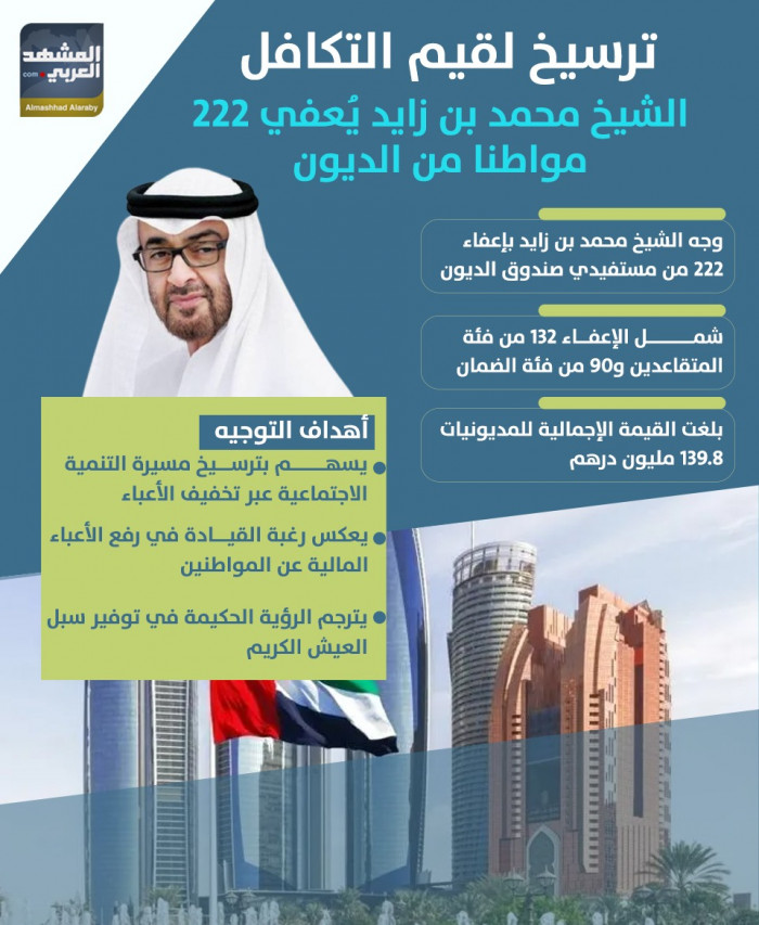 ترسيخ لقيم التكافل.. الشيخ محمد بن زايد يعفي 222 مواطنا من الديون (إنفوجراف)