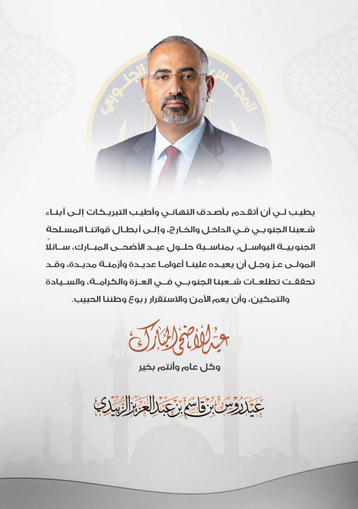 هنأ الرئيس عيدروس الزُبيدي، رئيس المجلس الانتقالي الجنوبي، نائب رئيس مجلس القيادة الرئاسي، أبناء شعبنا الجنوبي في الداخل والخارج، وأبطال قواتنا المسلحة الجنوبية البواسل، بمناسبة حلول عيد الأضحى المبارك.
