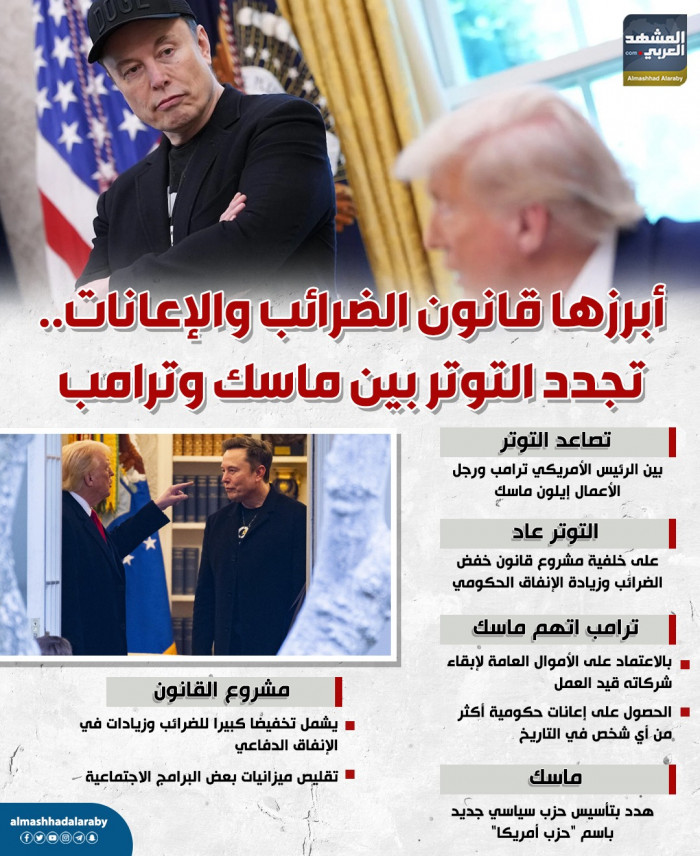 أبرزها قانون الضرائب والإعانات.. تجدد التوتر بين ماسك وترامب (إنفوجراف)