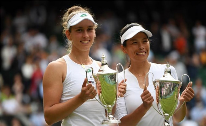 قلب الثنائي فيرونيكا كوديرميتوفا وإليسه ميرتنز المصنف ثامنا تأخره بمجموعة ليحصد أول ألقابه في البطولات الأربع الكبرى للتنس على صعيد الزوجي، بفوزهما على هسيه سو-وي وإيلينا أوستابينكو 3-6 و6-2 و6-4 في نهائي زوجي السيدات لبطولة ويمبلدون اليوم الأحد.