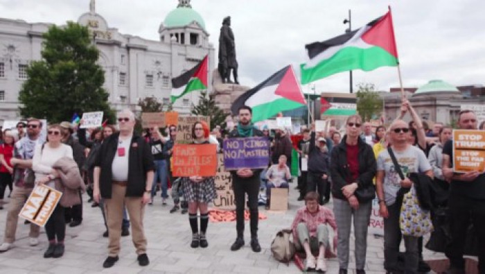 ورفع المتظاهرون عند ميناء آيوس نيكولاوس لافتات كتب عليها "أوقفوا الإبادة" مع اقتراب السفينة "كراون آيرس".