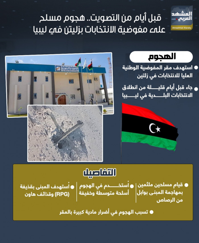 قبل أيام من التصويت.. هجوم مسلح على مفوضية الانتخابات بزليتن في ليبيا (إنفوجراف)
