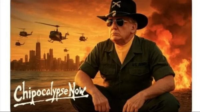 نشر الرئيس الأمريكي، دونالد ترامب، السبت، صورة ساخرة من فيلم "نهاية العالم الآن" تصور كرة لهب تحلق فوق ثاني أكبر مدينة في البلاد بينما تقترب المروحيات، ويظهر بها مرتديًا زيًا عسكريًا.