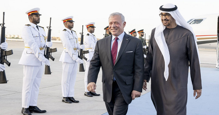 وكان الشيخ محمد بن زايد آل نهيان رئيس دولة الإمارات، في مقدمة مستقبلي الملك عبدالله الثاني لدى وصوله والوفد المرافق مطار البطين في أبوظبي.