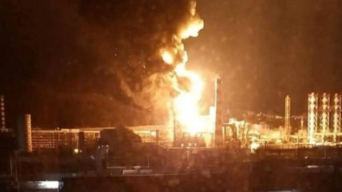 وتصاعدت ألسنة اللهب وهي تندلع من صهاريج التخزين في المصفاة الروسية التي تقع في شمال غرب البلاد، وتصل طاقتها التكريرية إلى 18 مليون برميل سنويًا من النفط الخام.