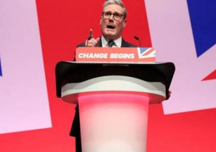 قاطع متظاهر يرفع العلم الفلسطيني وزيرة المالية البريطانية ريتشل ريفز اليوم خلال إلقاء خطاب في مؤتمر لحزب العمال في ليفربول.