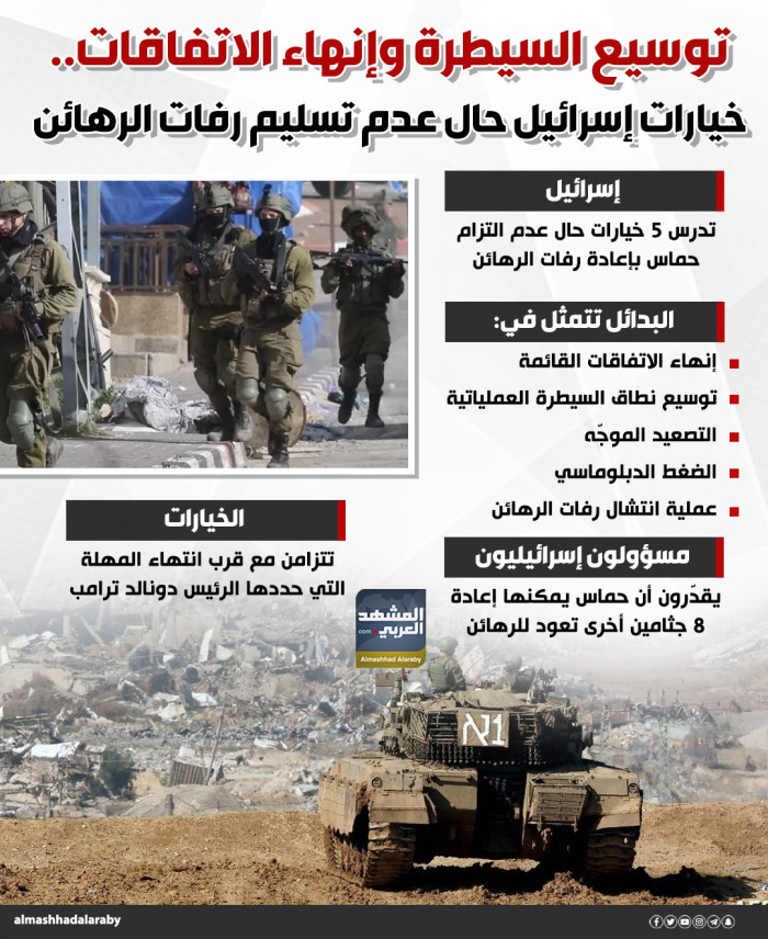 توسيع السيطرة وإنهاء الاتفاقات.. خيارات إسرائيل حال عدم تسليم رفات الرهائن (إنفوجراف)