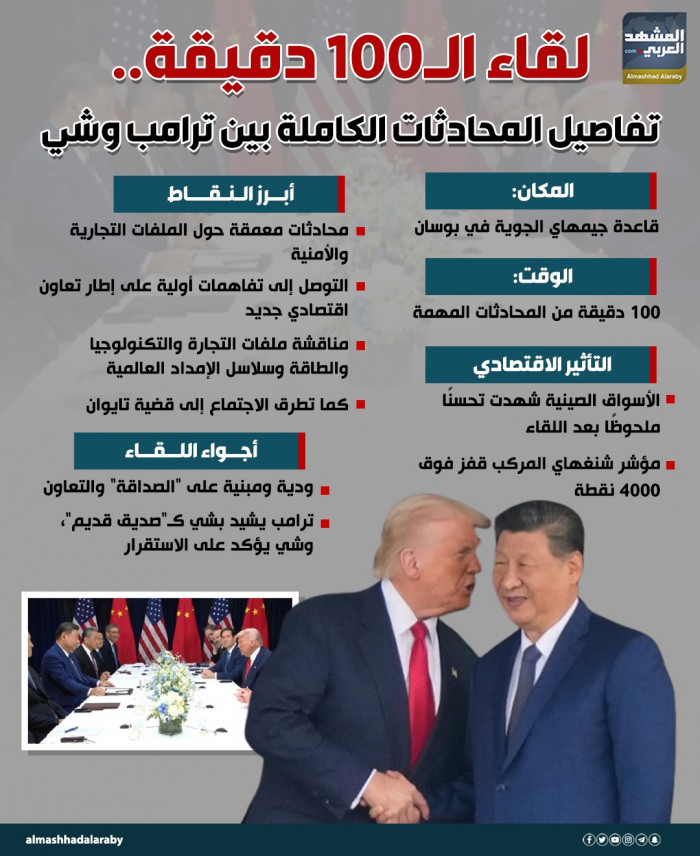 لقاء الـ100 دقيقة.. تفاصيل المحادثات الكاملة بين ترامب وشي (إنفوجراف)