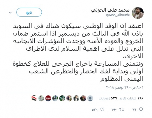 كشف رئيس ما تسمى اللجنة الثورية العليا للمليشيات الحوثية محمد علي الحوثي عن أن وفد جماعته سيحضر مفاوضات السلام المقرر إجراؤها في السويد مطلع الشهر المقبل.