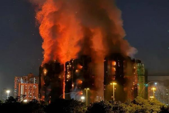 واندلع حريق ضخم يوم الأربعاء الماضي، في مجمع وانج فوك كورت السكني بمنطقة تايو، طال عدة أبراج شاهقة كانت تخضع لأعمال تجديد.