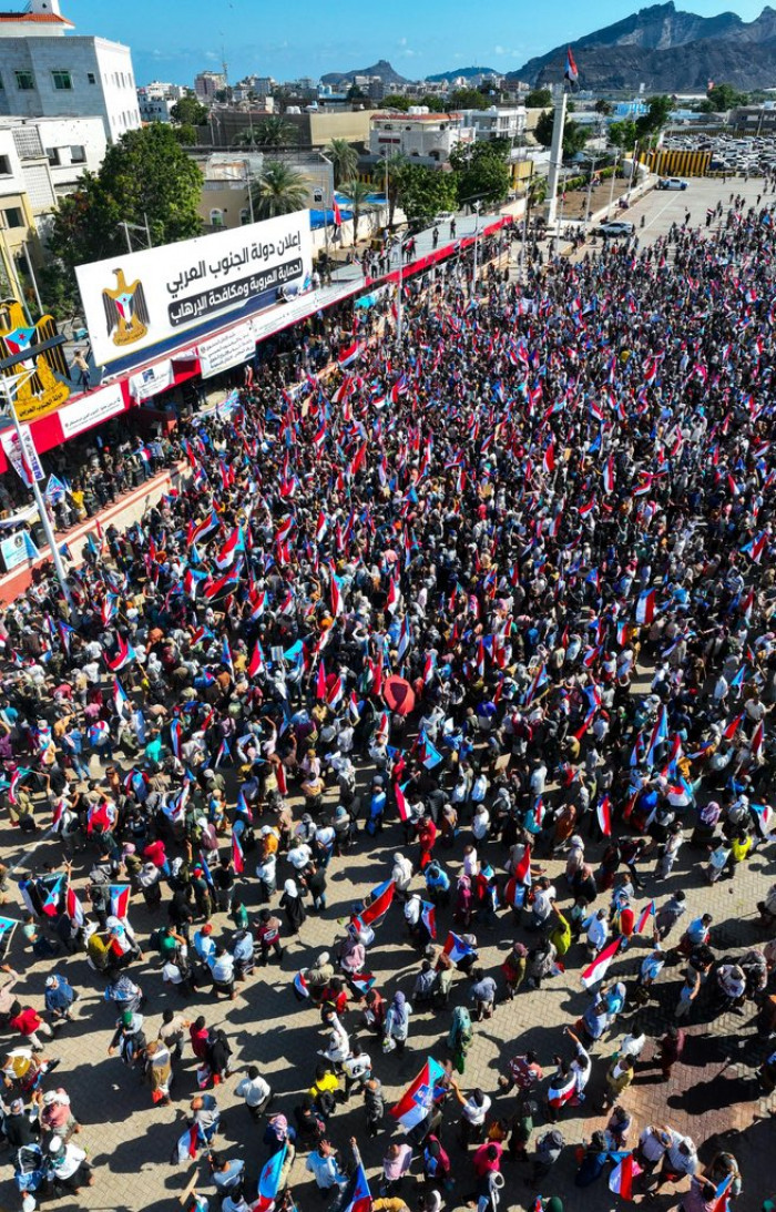 توافد الآلاف من المواطنين، صباح اليوم الجمعة، إلى ساحة العروض بالعاصمة عدن، رفضا لقرارات المدعو رشاد العليمي، رئيس مجلس القيادة.