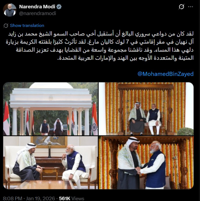 غرد ناريندرا مودي رئيس وزراء جمهورية الهند اليوم الإثنين، عقب مغادرة رئيس الإمارات الشيخ محمد بن زايد، العاصمة الهندية نيودلهي، في زيارة عمل إلى جمهورية الهند.