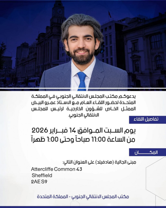 دعا مكتب المجلس الانتقالي الجنوبي في المملكة المتحدة، إلى حضور اللقاء العام مع عمرو البيض الممثل الخاص للشؤون الخارجية لرئيس للمجلس الانتقالي الجنوبي.