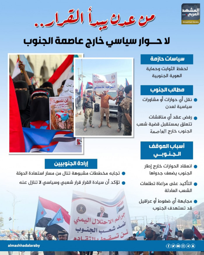 من عدن يبدأ القرار.. لا حوار سياسي خارج عاصمة الجنوب (إنفوجراف)