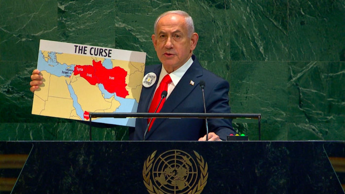 واستخدم نتنياهو خريطة للشرق الأوسط مع تمييز المحور الإيراني بـ"اللون الأحمر" كأداة مساعدة، كما شمل التصنيف كلًا من العراق وسوريا واليمن إلى جانب إيران.