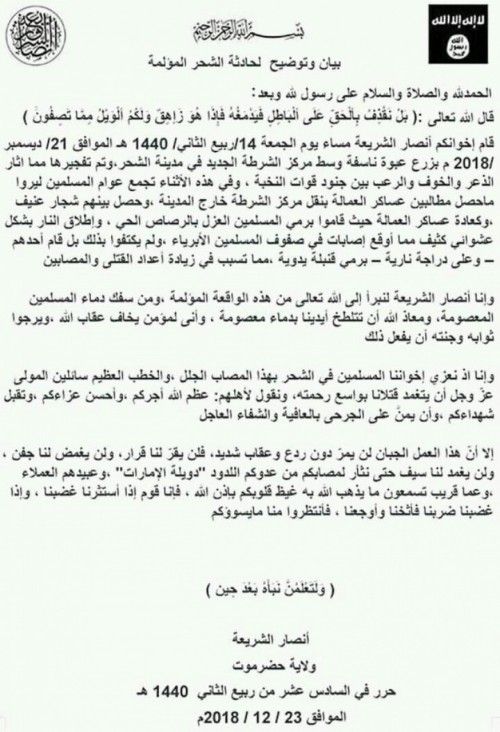 وزعم التنظيم في بيانه، أن العملية الإرهابية قامت بها القوات الأمنية والنخبة، نافياً قيام مقاتليه باستهداف المواطنين .