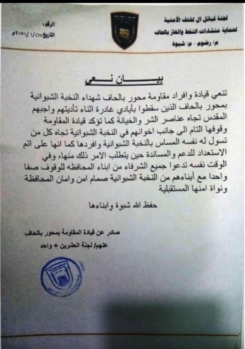 كما تؤكد قيادة المقاومة وقوفها التام إلى جانب إخوانهم في النخبة الشبوانية، تجاه كل من تسول له نفسه المساس بالنخبة الشبوانية وأفرادها، كما أنها على أتم الاستعداد للدعم والمساندة حين يتطلب الأمر ذلك منها، وفي الوقت نفسه تدعوا جميع الشرفاء من أبناء المحافظه للوقوف صفا واحدا مع أبناءهم من النخبة الشبوانية صمام أمن وأمان المحافظة ونواة أمنها المستقبلية.
