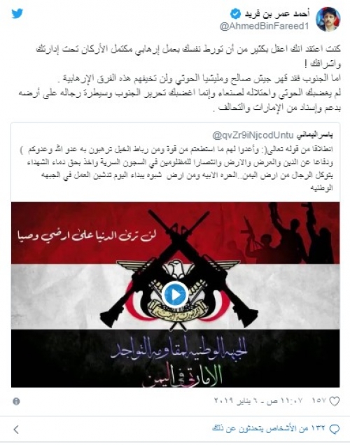وأضاف: "الجنوب قهر جيش صالح ومليشيا الحوثي، ولن تخيفهم هذه الفرق الإرهابية. لم يغضبك الحوثي واحتلاله لصنعاء وإنما أغضبك تحرير الجنوب وسيطرة رجاله على أرضه بدعم وإسناد من الإمارات والتحالف ".