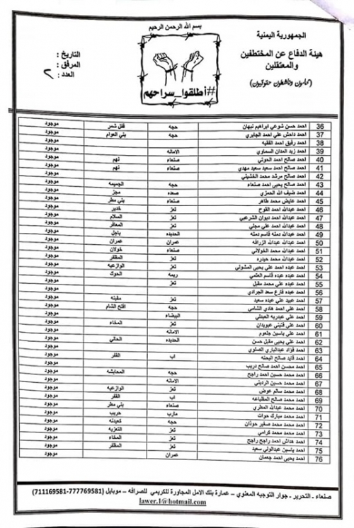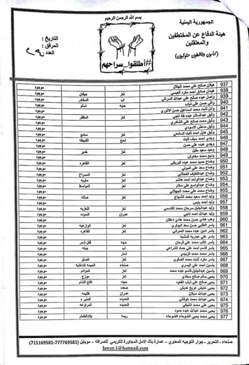 نشرت هيئة الدفاع عن المعتقلين والمختطفين في صنعاء، كشوفاً تضم أسماء ألف أسير ومختطف قالت إن مليشيا الحوثي الانقلابية وافقت على إطلاق سراحهم ضمن صفقة تبادل أسرى بمختطفين والتي أبرمت في مشاورات السويد.