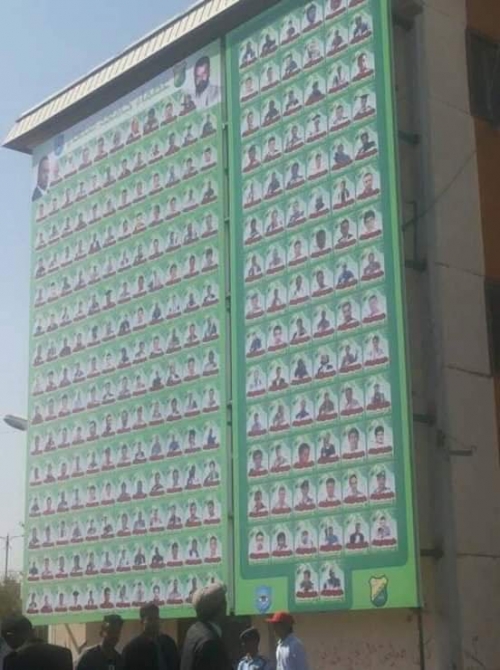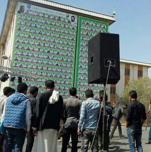 وعرضت مليشيات الحوثي الانقلابية، جداريات ضخمة للقتلى من طلاب جامعة صنعاء الذين دفعت بهم إلى جبهات القتال، على مباني الجامعة.